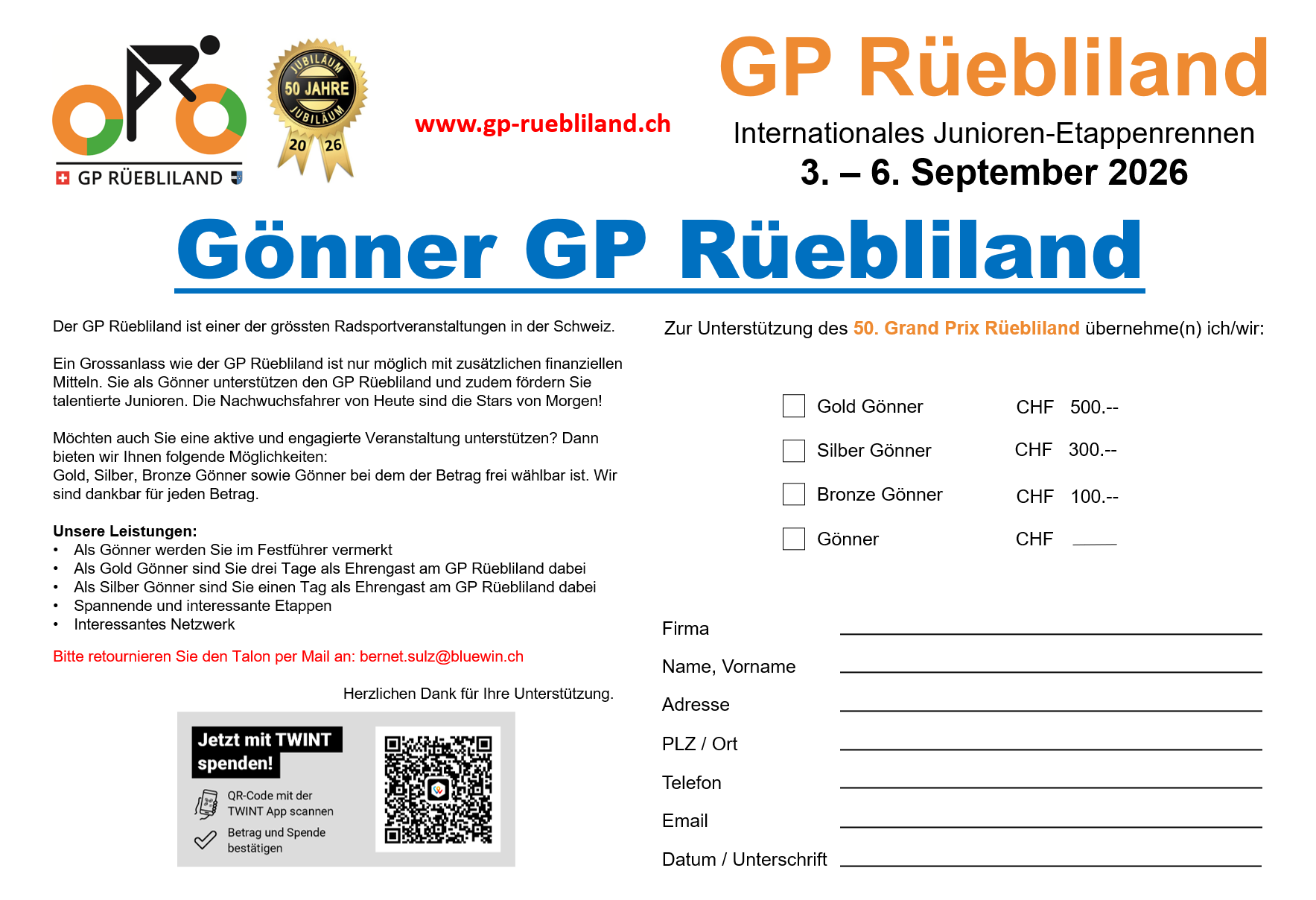 Der deutsche Nachwuchsrennstall GRENKE-Auto Eder dominierte den diesjährigen GP Rüebliland von A bis Z. Das Team gewann mit Karl Herzog (1. Etappe), Noah Lindholm Moeller Andersen, Dänemark (Etappensieger 2 und 3) sowie Gesamtsieger Karl Herzog so ziemlich alles was es zu gewinnen gab. In der entscheidenden letzten und gleichzeitig schwersten Etappe versuchten verschiedene Fahrer anderer Teams ihr Glück mit Angriffen, doch das Team GRENKE-Auto Eder reagierte jeweils prompt und hatte das Rennen somit grossmehrheitlich im Griff.
